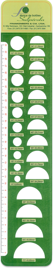 Fabricamos botões de 14 à 72 linhas. Lembrando que uma linha é uma medida inglesa que representa 0,635mm. Abaixo segue imagem de uma régua que pode ajudar você a escolher o tamanho certo. Boas compras!